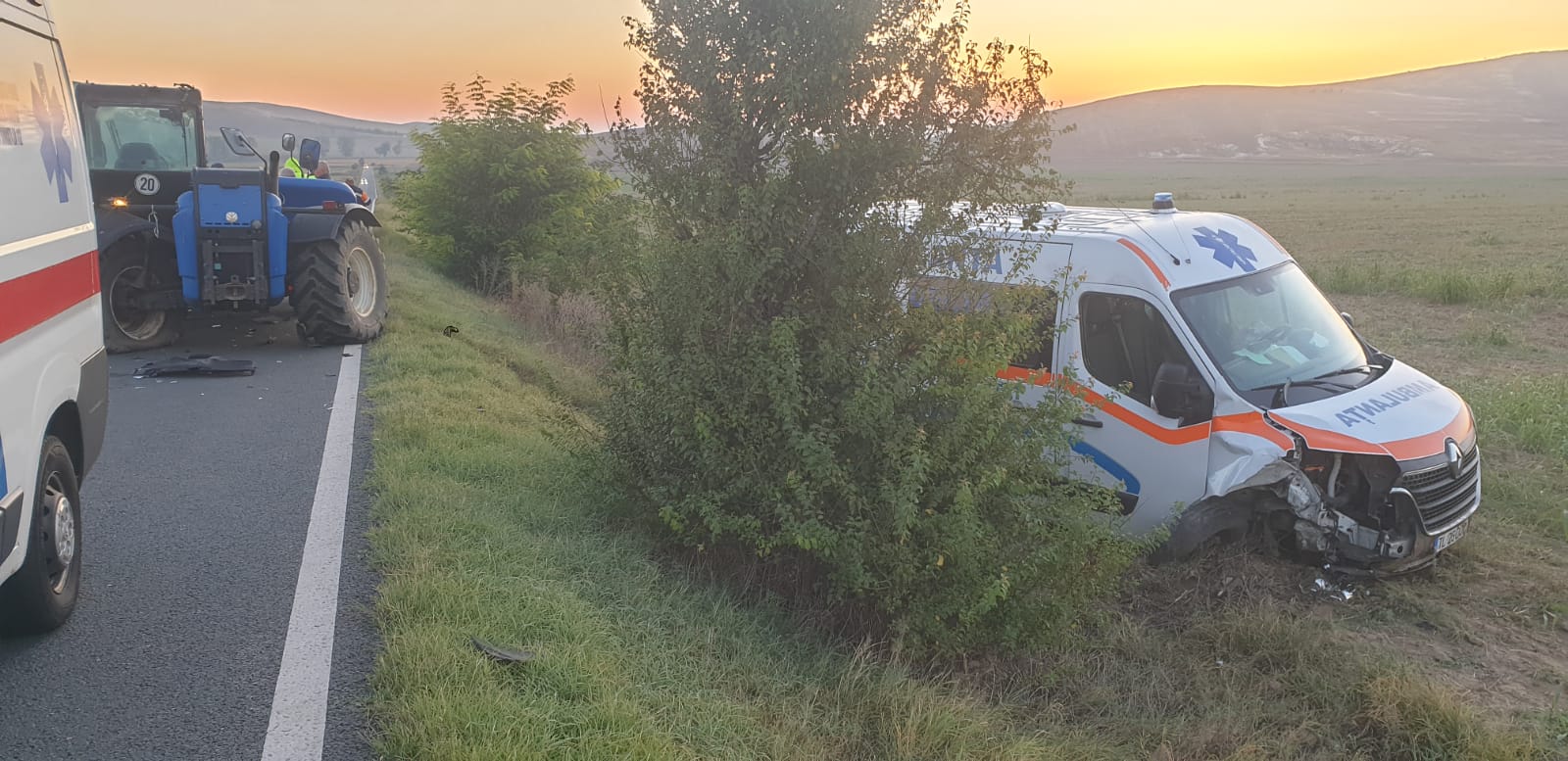 Accident rutier între un utilaj agricol și un autovehicul special de transport medical privat pe DN 22 A