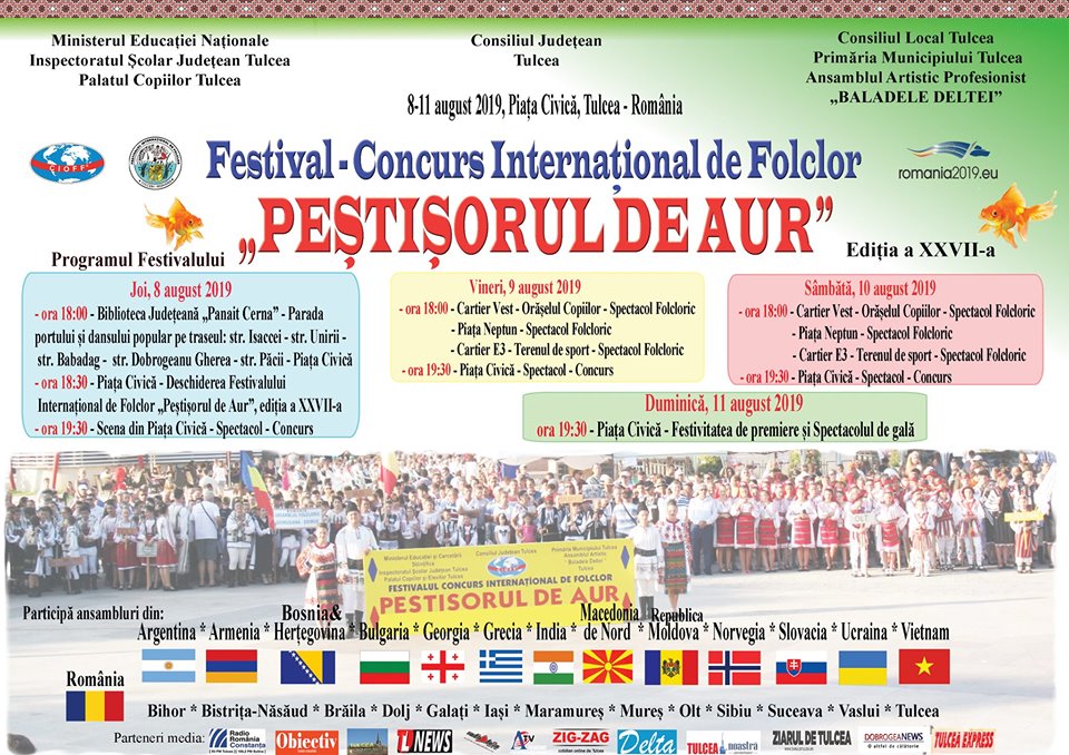 Pestisorul de aur 2019Timp de patru zile, între 8 și 11 august, pe faleza orașului Tulcea se vor întrece în muzică tradițională și dansuri ansambluri folclorice din mai...