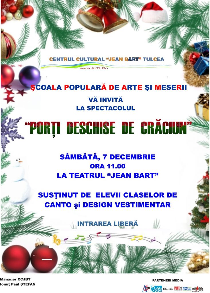 Porti deschise de CraciunSambata, 7 decembrie, ora 11.00 Scoala Populara Tulcea la spectacolul "Porţi deschise de Crăciun", sustinut de elevii claselor de canto si design...