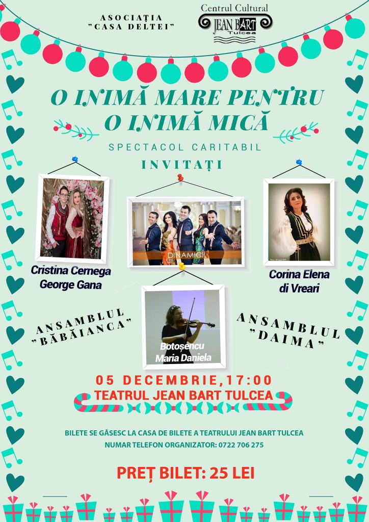 O inima mare pentru o inima micaAsociația „Casa Deltei“ cu sprijinul Consiliului Județean Tulcea, prin Centrul Cultural „Jean Bart“, organizează joi, 5 decembrie 2019, de la ora...