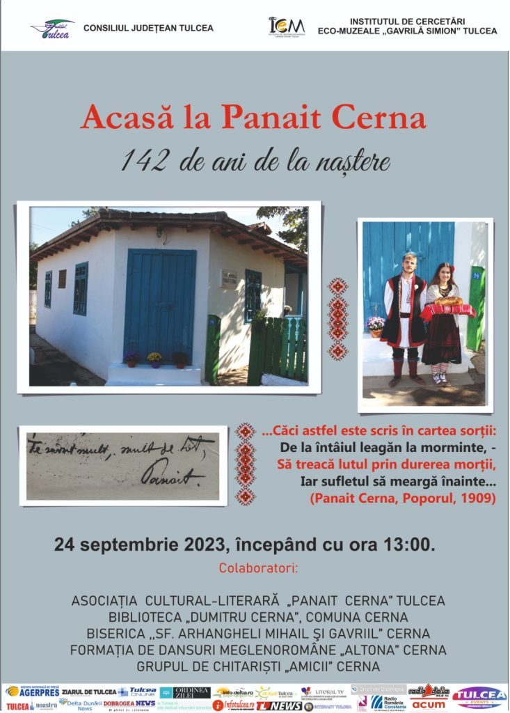 Acasa Panait Cerna – 142 de ani de la nastereDuminică, 24 septembrie 2023, începând cu ora 13, Institutul de Cercetări Eco-Muzeale ”Gavrilă Simion” Tulcea vă invită la Casa Memorială Panait...